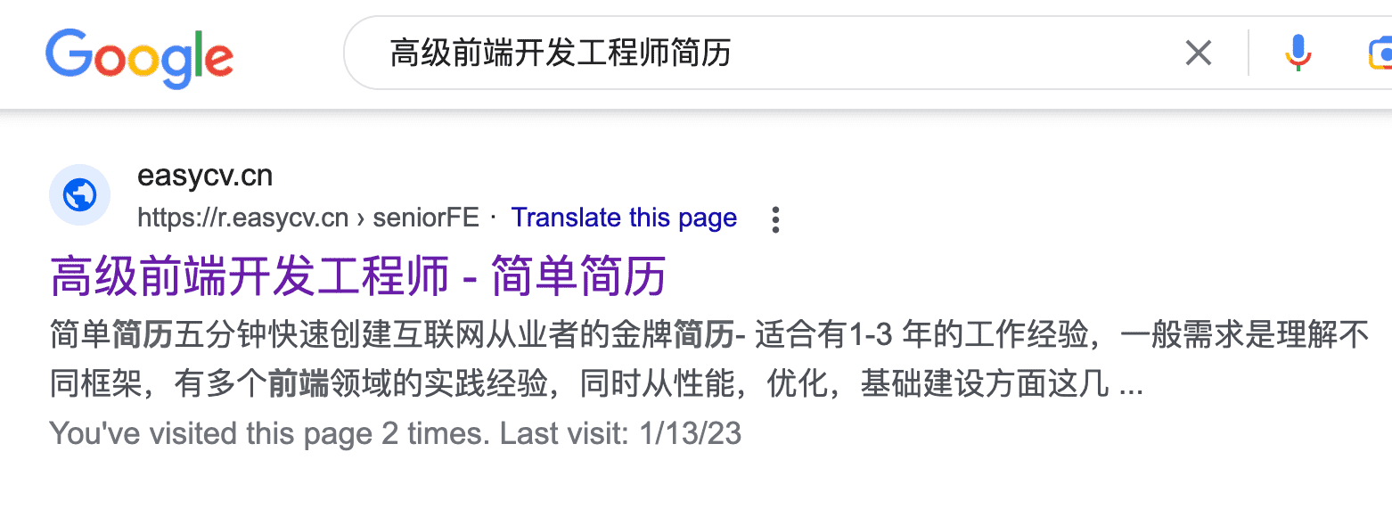 在 google 搜索高级前端开发工程师 简历 排名第一