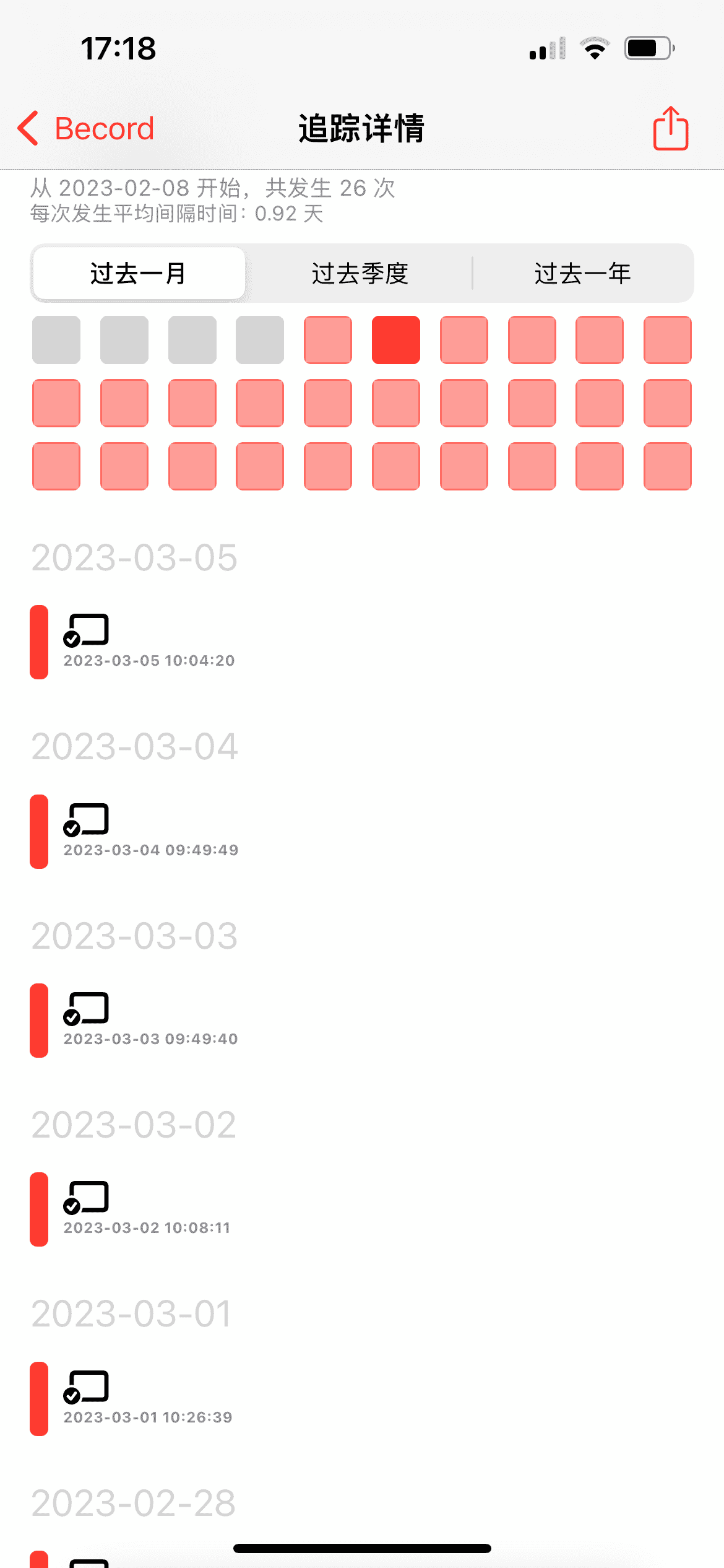 这个点我已经说了多次了,不过这次我转变了一下机制,我发现最大的流量池以及是最快成长的观众来自于蓝鸟,我就为自己定了一个计划,每天更新一篇,不需要和我的产品相关,分享工作中遇到的优质资源。每篇阅读量都很可观(大约4,5万)这也让我的粉丝数上升的非常明显,为了监督自己,我下载了一个类似 Github Commit 的网格工具。用可视化的方式记录自己,人都是有仪式感的动物,使用这类的工具可以更好的帮助你坚持对应的习惯。