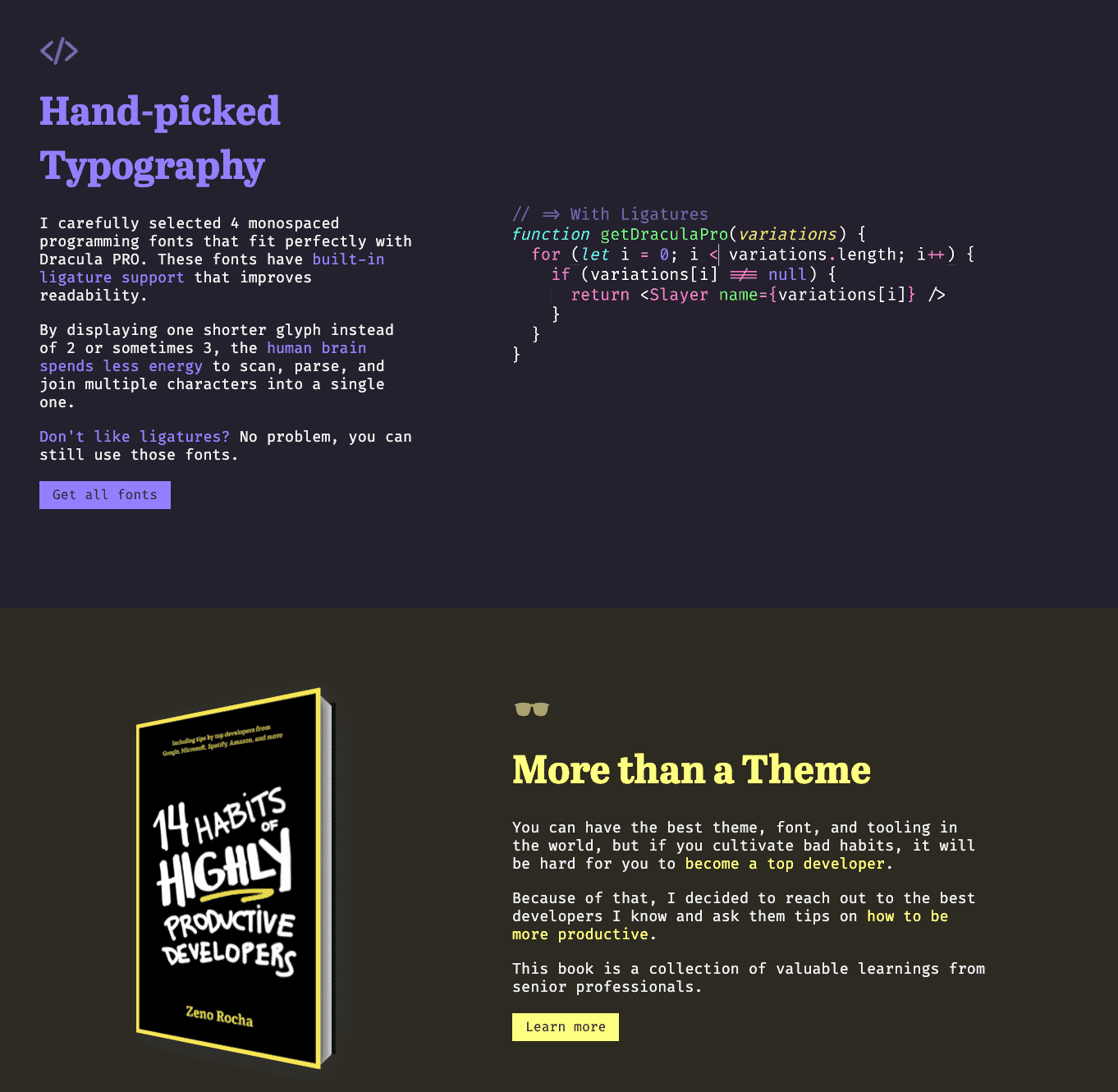 作者这个时候的做法是制造差异化,做一个付费的项目,所以它在 Dracula 的基础上又开发出了 Dracula Pro,一听 Pro 这个名称就让人感觉不明觉厉。但是简简单单换一个颜色能打动挑剔的程序员去付费吗?那肯定是不够的,所以这个时候它就想到了捆绑销售,来官网看看:https://draculatheme.com/pro#get
