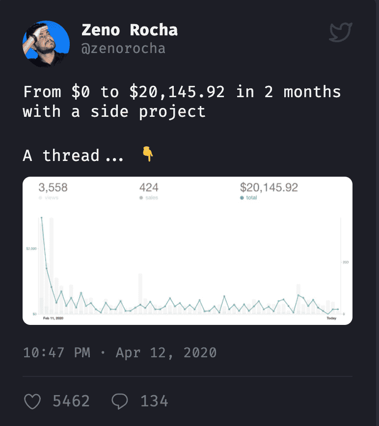 Zeno 继续将所有的数据和经验持续更新在 twitter 上,这种方式让产品持续的曝光在其他人的时间线上,别人可以从中吸收到很多的信息,同时产品的关注者也越来越多。这种积累可以出发量变引起质变的效果。 他发出的一个 twitter 突然就火了,当然标题也很有噱头“两个月,个人项目从0到怒赚两万刀”,这个给主题的销量带来了非常强劲的上升。