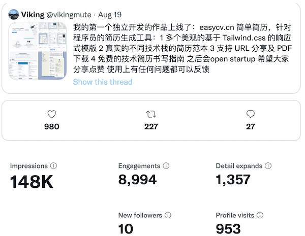 对于文章,我认为不要写硬广,而是围绕产品的主题,写言之有物的文章,顺带推荐自己的产品。我这次发表的内容是:《半小时视频+万字长文教你怎样打造程序员的金牌简历?》,我对自己的视频和文章要求比较高,每个视频都配合对应的文章,争取在多个平台发表,多少都能带来一些流量,苍蝇腿也是肉。发布的平台有:公众号,知乎,B站,油管,个人网站。不得不说公众号太烂了,垃圾编辑器,不支持链接,而且对于这些很技术性的文章,流量都很低,但是为了那么一点流量,我忍了。不过后来所有的文字内容的链接,我都留了个人网站的 Permlink。