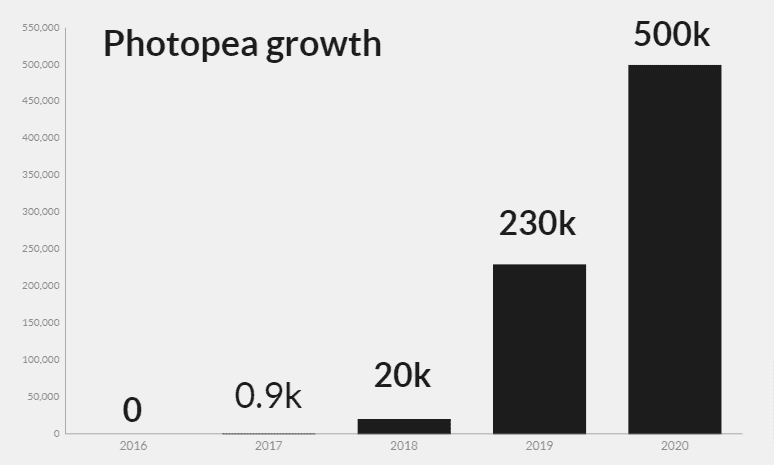 在线 PS 有着巨大的用户需求,就拿我本人来说,前几天想简单编辑一张图片,但是我又不想下载臃肿的客户端软件,我是一个 web 的信徒,相信一串 URL 代表着稳定的功能和资源。就是这个时候我接触到了 Photopea,并且用它非常方便的修改完了这张图,后来我将这个工具安利给了很多人。 很多人都和我有一样的需求,所以它们到找到了 photopea,2021年3月31日 Ivan 在接受 Indie Hacker 的采访中说,每天有 30万人使用,所有人的使用时间加起来每天有 45000 小时。7 年来,photopea 在的用户在不断惊人的增长。Ivan 一直将它作为免费的产品提供给大家,那么他的盈利是怎样来的呢?