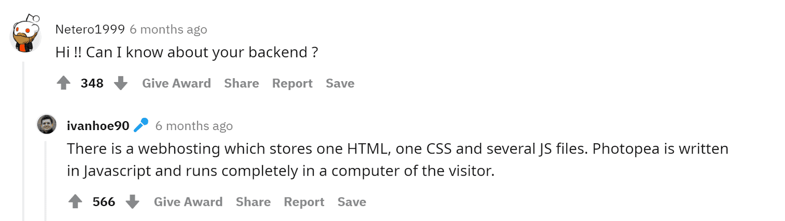 一个 reddit 的问答 网友:“想了解 Photopea 关于后端的配置“ Ivan:“Photopea 只有一个 html,一个 css 以及几个 js 静态文件组成,功能完全由 Javascript 驱动,在浏览器端运行”