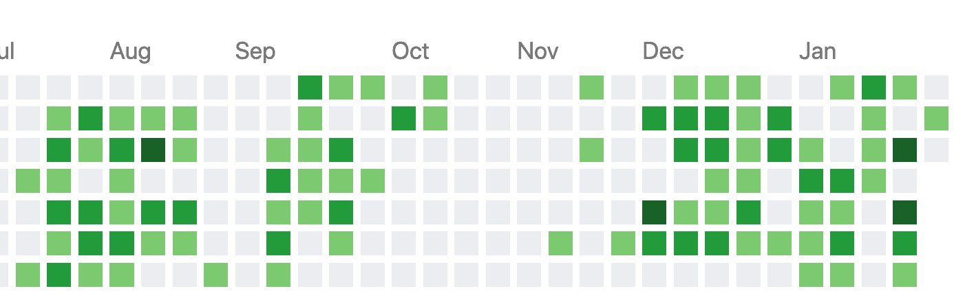 我自从成为独立开发者以来,发现我已经完全模糊了双休日的概念,你想完成一个产品,你会非常主动的去工作,就像是它在推动你前进。所以这次疫情对我来说,影响几乎是零,每天还保持着一样的作息时间,过年也是在上海,没有回老家。这是我半年以来的 github 提交记录。(11月份在主要是在做课程的筹备和规划),所以我觉得有这样的经验很重要,它让你了解到在家里呆着也是能创造价值的。
