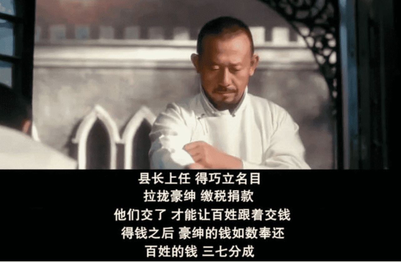 “县长上任,得巧立名目,拉拢豪绅,缴税捐款。他们交了,才能让百姓跟着交钱。得钱之后,豪绅的钱如数奉还。百姓的钱三七分成。 ”