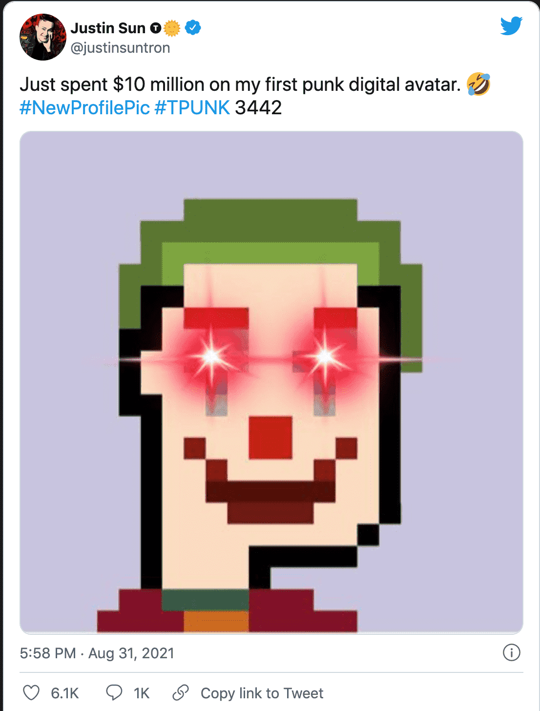 孙宇晨,justin sun,一个貌似臭名昭著的名字,aka 孙哥,花 480万美元拍卖下和巴菲特共进晚餐的那位著名的韭菜收割家。花了 1050 万美元买下了一个像素风的小丑头像。这一系列的头像称之为 joker tpunk。也是Tpunks 头像系列,每个头像都有头发,眼睛,帽子,肤色等等。